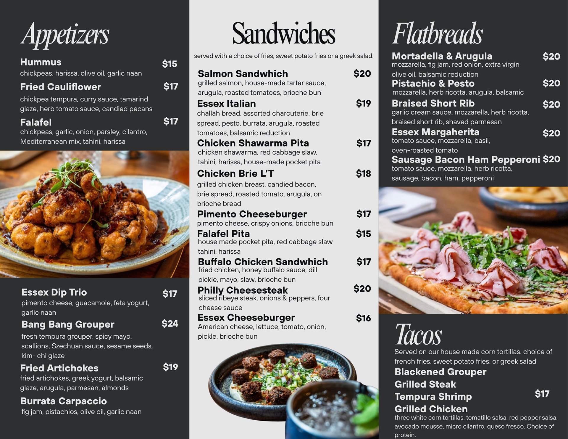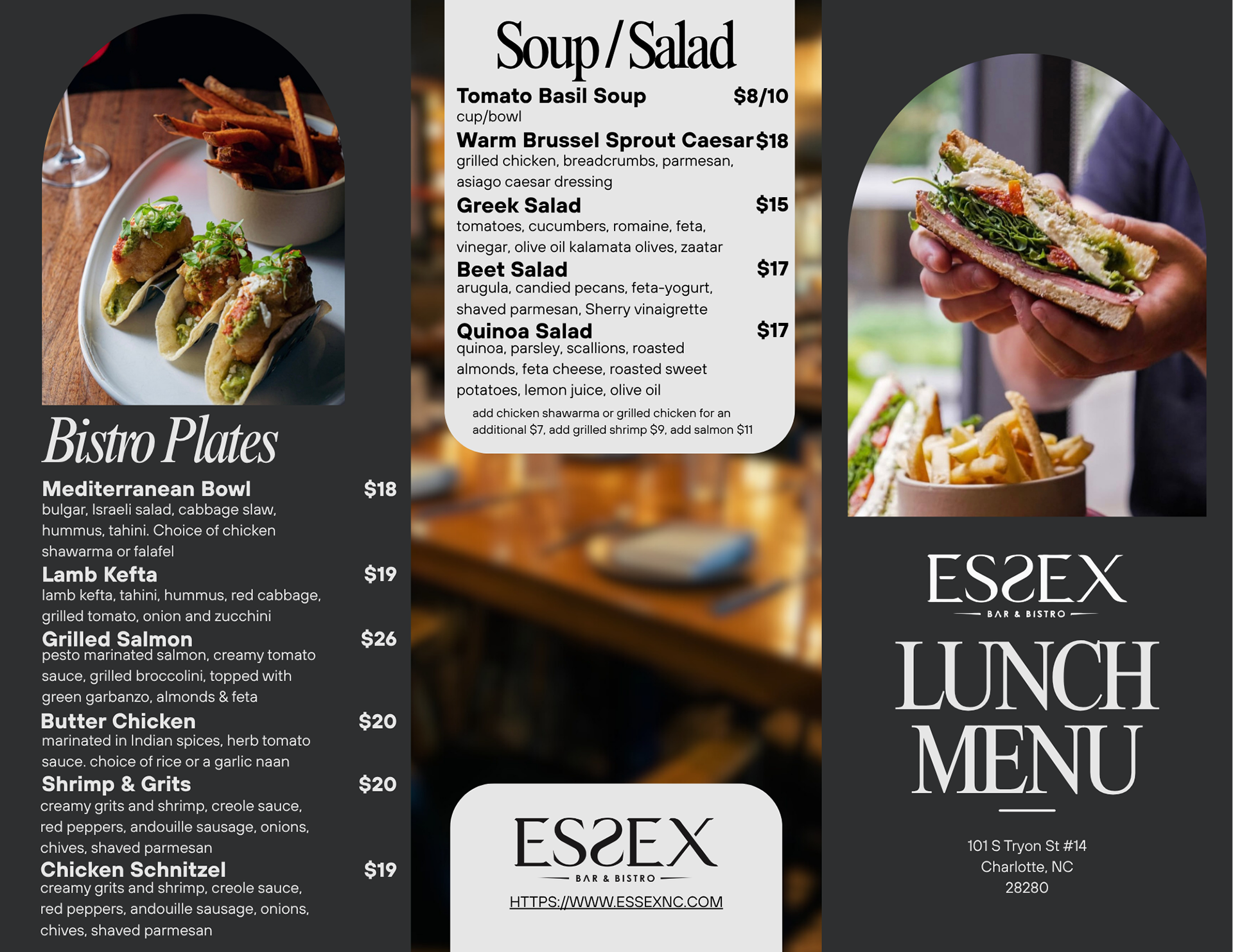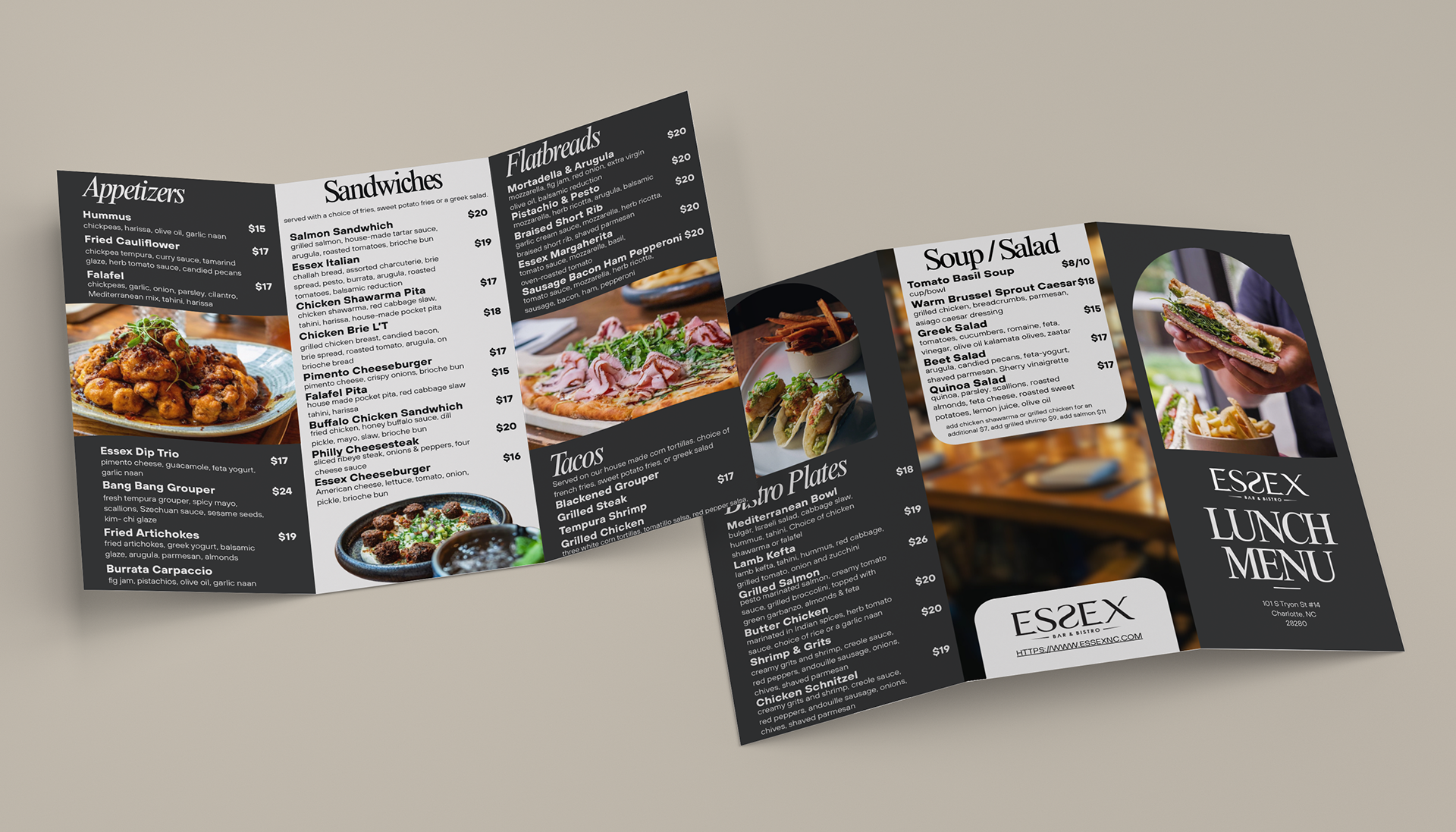 Designed a tri-fold brochure to promote Essex’s lunch takeout menu, aimed at boosting midday orders. The brochure highlighted quick, affordable options with a clean, appetizing layout to attract nearby workers and passersby.