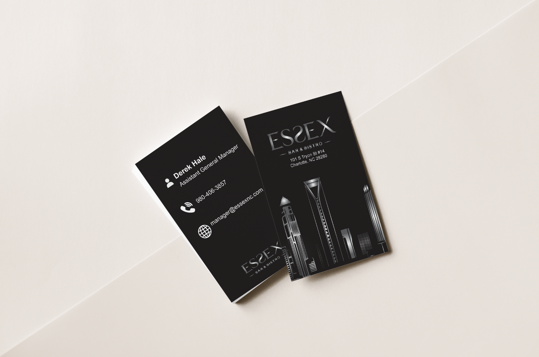Business cards designed for Essex Bar & Bistro located in the heart of Uptown Charlotte, North Carolina.