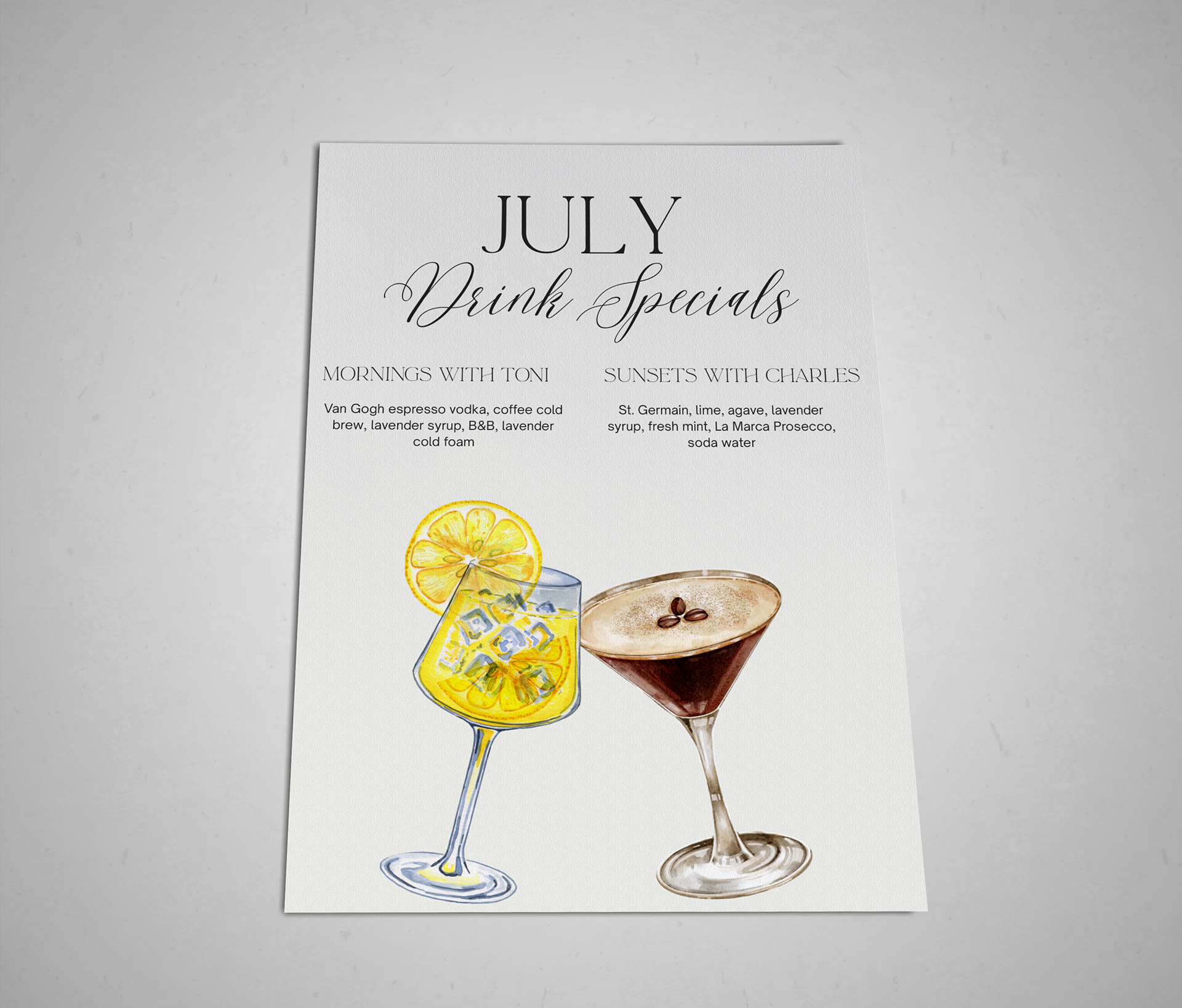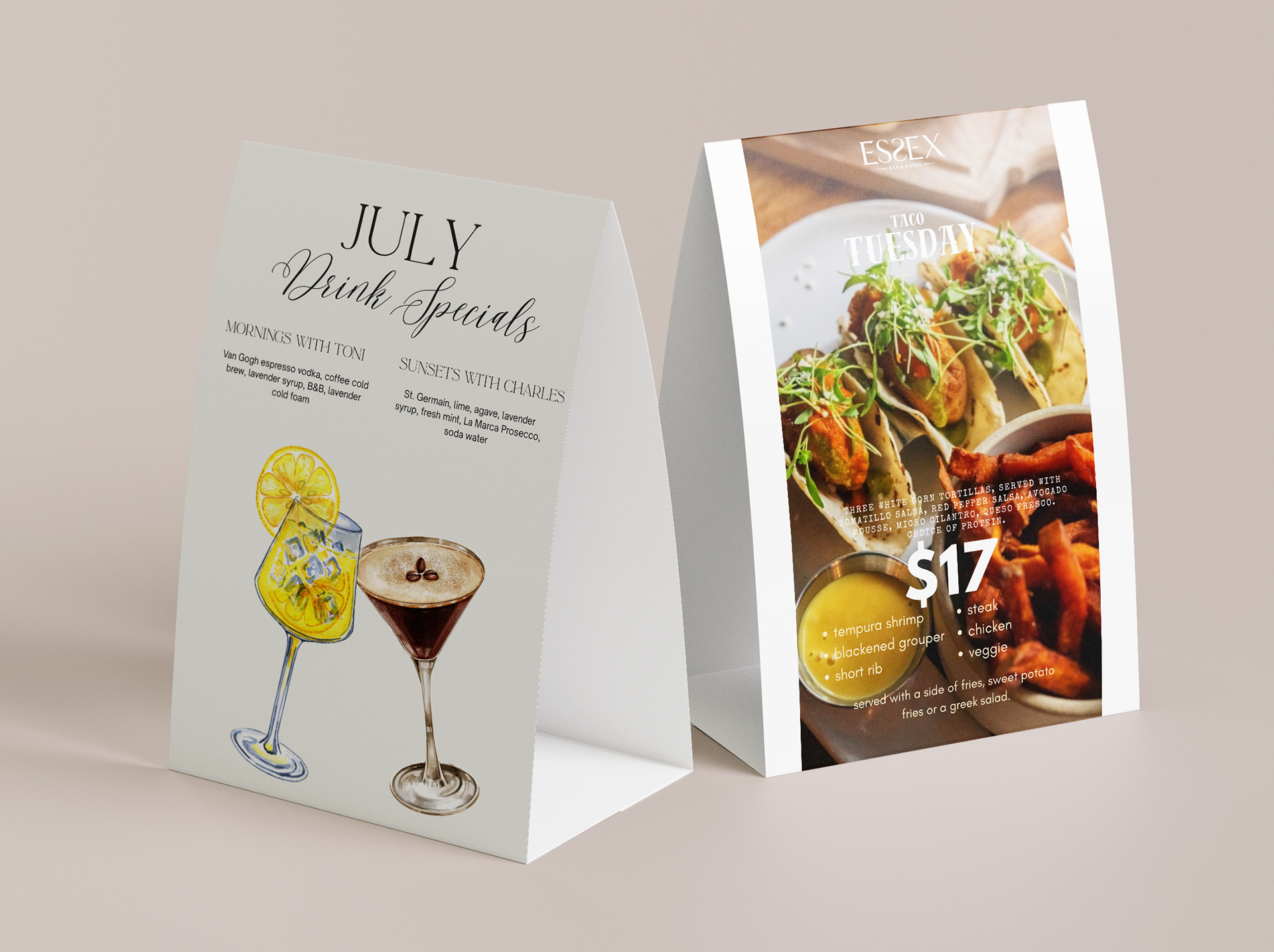 Designed visually engaging table tents to promote limited-time specials at Essex Bistro. Each layout was crafted to catch attention and drive interest directly at the table, resulting in increased orders for featured menu items.